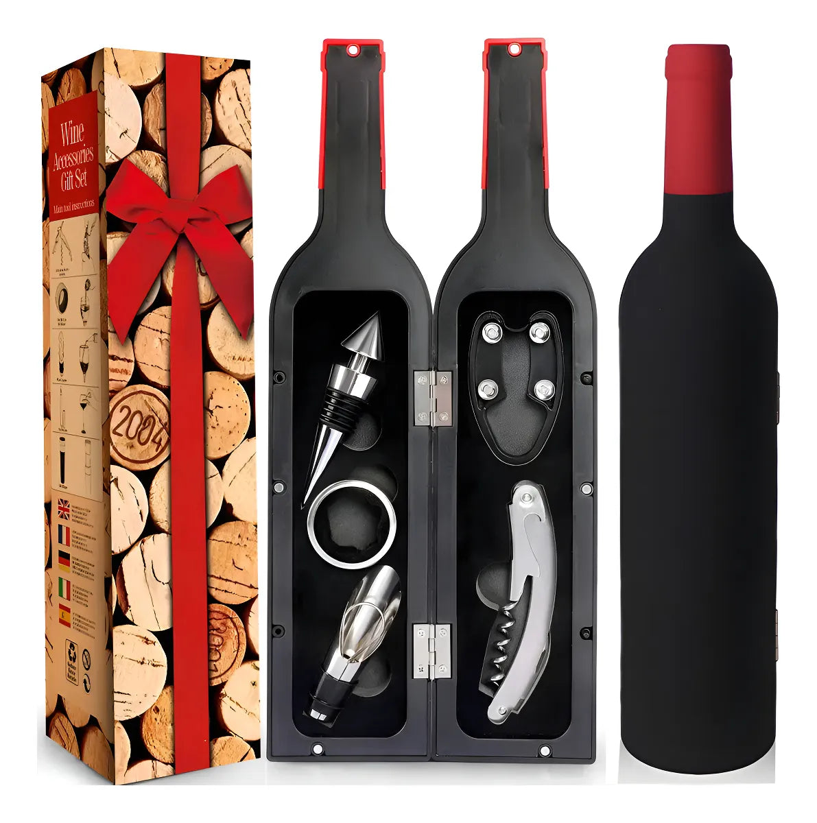 Este Set de Accesorios para Vino 5 en 1 es la opción perfecta: práctico, completo y presentado en una caja con forma de botella que encanta desde el primer segundo.